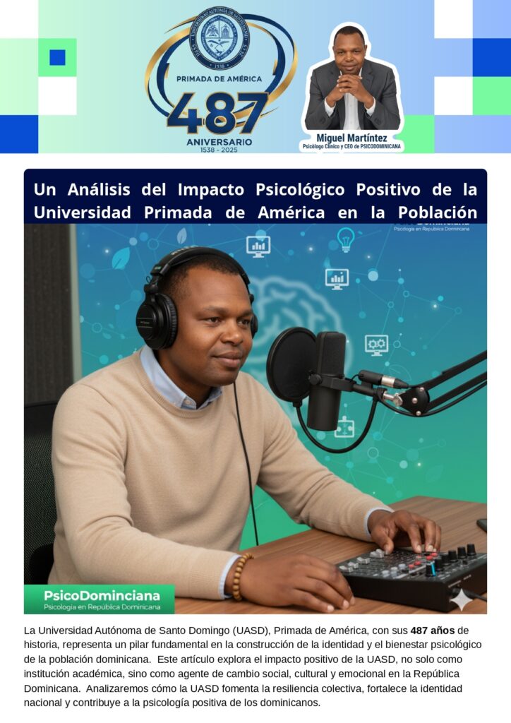 La Universidad Autónoma de Santo Domingo (UASD), Primada de América, con sus 487 años de historia, representa un pilar fundamental en la construcción de la identidad y el bienestar psicológico de la población dominicana. Este artículo explora el impacto positivo de la UASD, no solo como institución académica, sino como agente de cambio social, cultural y emocional en la República Dominicana. Analizaremos cómo la UASD fomenta la resiliencia colectiva, fortalece la identidad nacional y contribuye a la psicología positiva de los dominicanos.